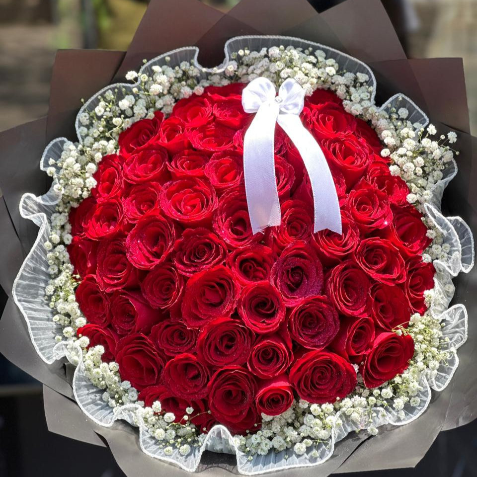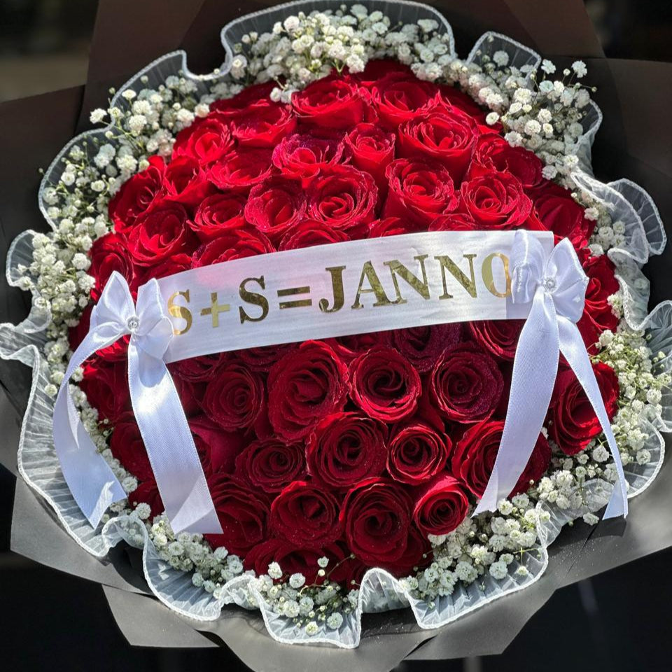 The "Flowy Red" bouquet features 60 radiant red roses encircled by soft baby's breath, creating a classic and elegant gift. Finished with a customized ribbon, it’s a perfect way to convey love and admiration for any special occasion.