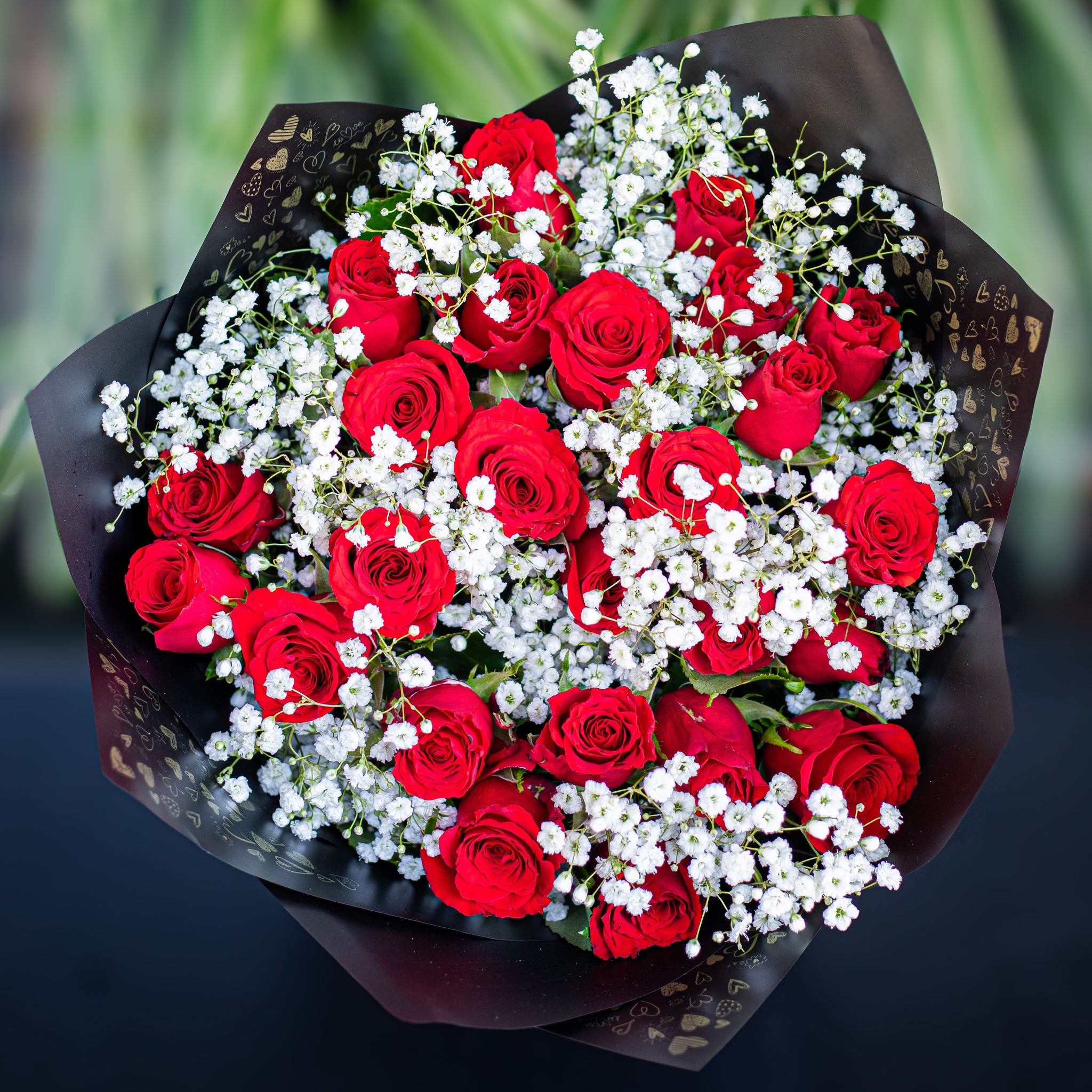 25 Ways to Love Celebrate romance with this stunning Valentine's arrangement of 25 premium red roses paired with delicate gypsophila. Each crimson bloom symbolizes deep affection, while the soft white filler flowers add an ethereal touch that frames the beauty of every rose. Perfect for expressing heartfelt devotion, this luxurious bouquet arrives fresh and ready to captivate. Whether marking an anniversary, proposal, or simply saying "I love you," this timeless combination speaks volumes. A gift as meaningful as the moment itself.