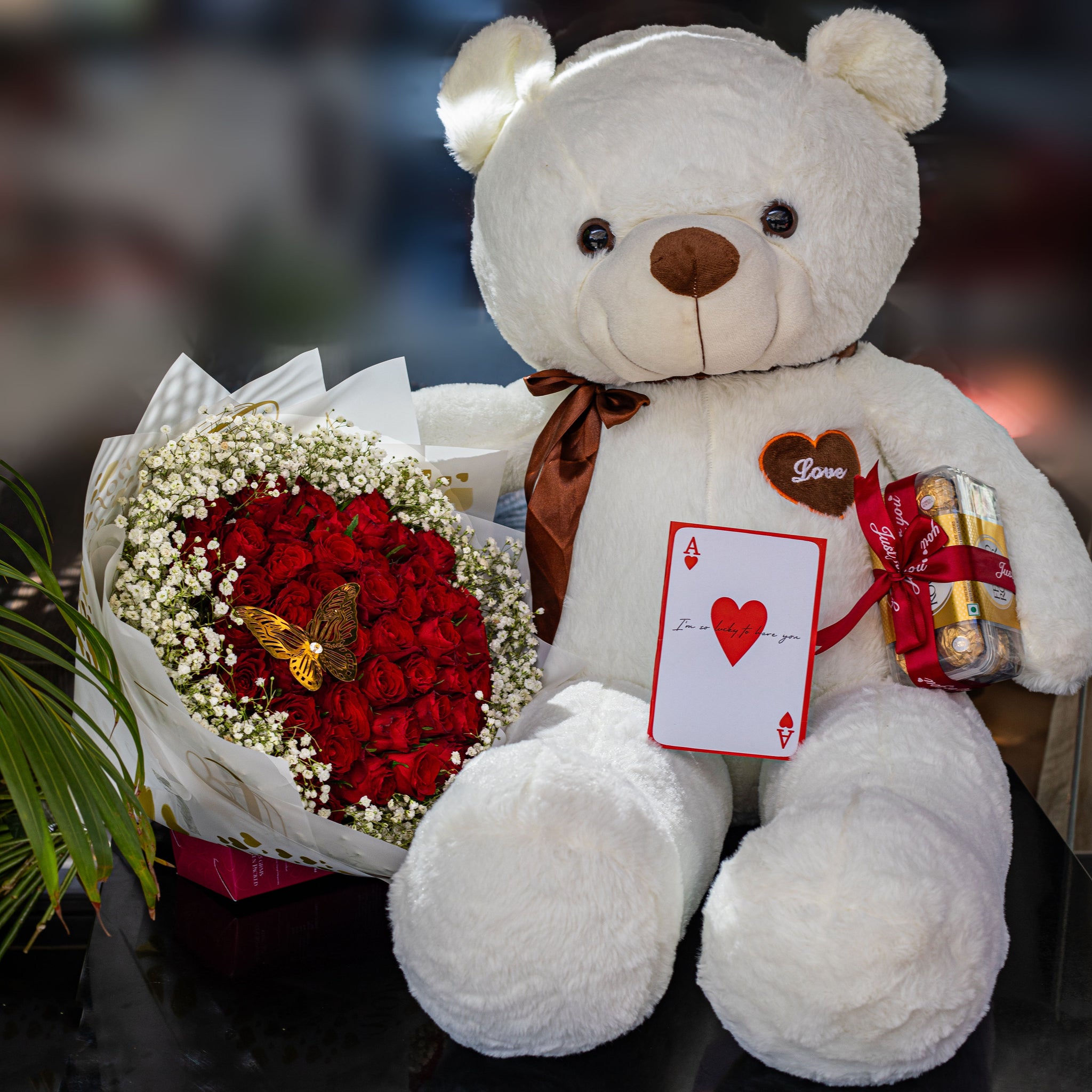 Hug Me Tight brings together three heartfelt elements in one unforgettable gift. Receive 50 stunning red roses arranged to perfection, a cuddly teddy bear for endless comfort, 16 pieces of Ferrero Rocher chocolates for a touch of indulgence, and a personalized card to express your deepest feelings. Ideal for anniversaries, proposals, or any moment that calls for romance and warmth. Each component is carefully selected to create a multi-sensory experience that speaks volumes without words.