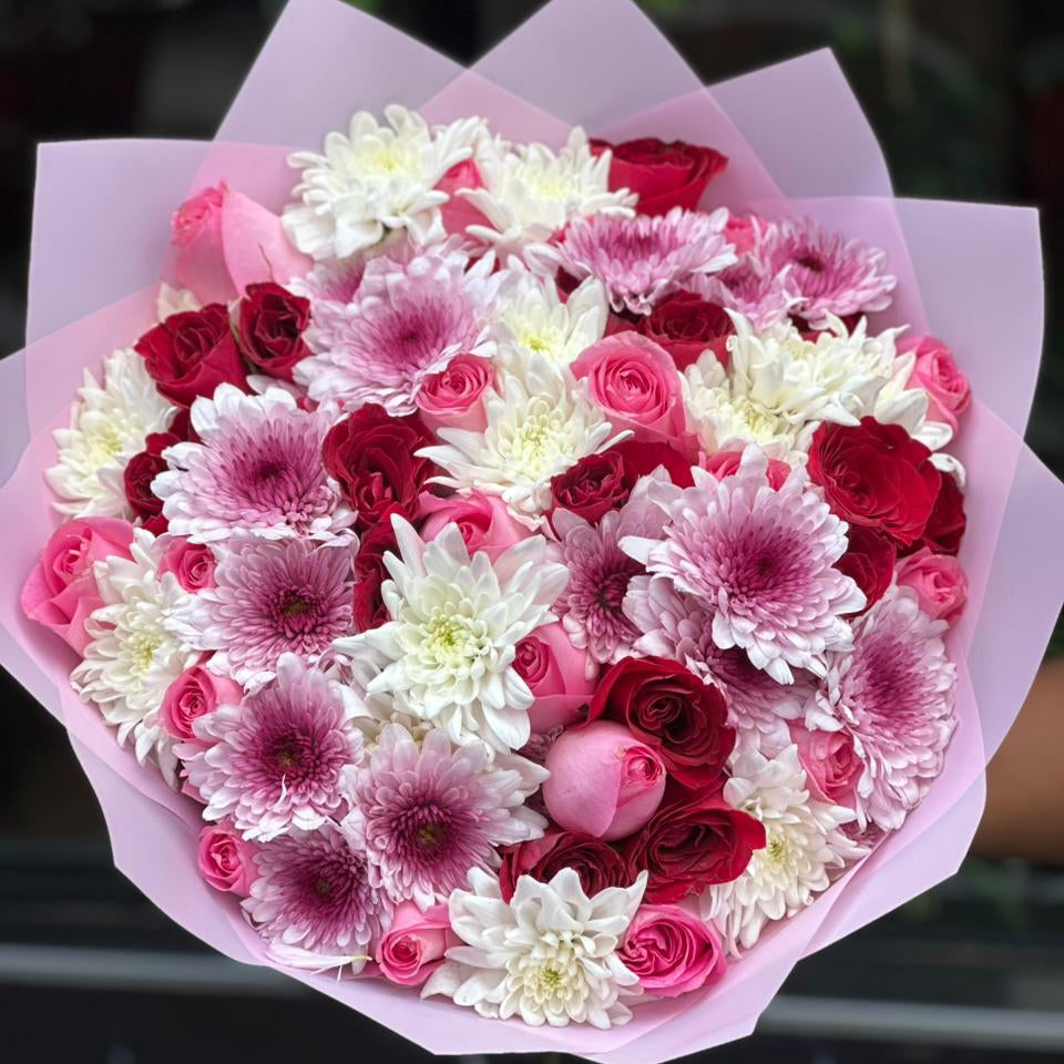 Pink Pam is a thoughtfully curated arrangement that brings together soft white mums with vibrant pink and red roses. The delicate mums provide an airy, romantic foundation while the roses add depth and elegance—perfect for expressing affection, celebration, or heartfelt appreciation. Each stem is selected to create a balanced composition that feels both luxurious and genuine. Ideal for anniversaries, birthdays, or whenever you want to send warmth wrapped in petals.