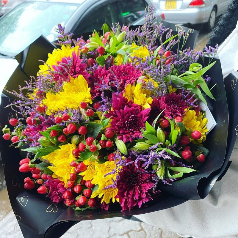 Brighten any occasion with the Radiant Chrysanthemum bouquet, featuring a fresh mix of vibrant, multi-colored chrysanthemums. Hand-tied and beautifully arranged, this cheerful bouquet symbolizes joy and positivity, making it a perfect gift for birthdays, anniversaries, or simply to uplift someone’s day. Its bold hues add a lively touch to any space, celebrating life’s happiest moments with warmth and color.