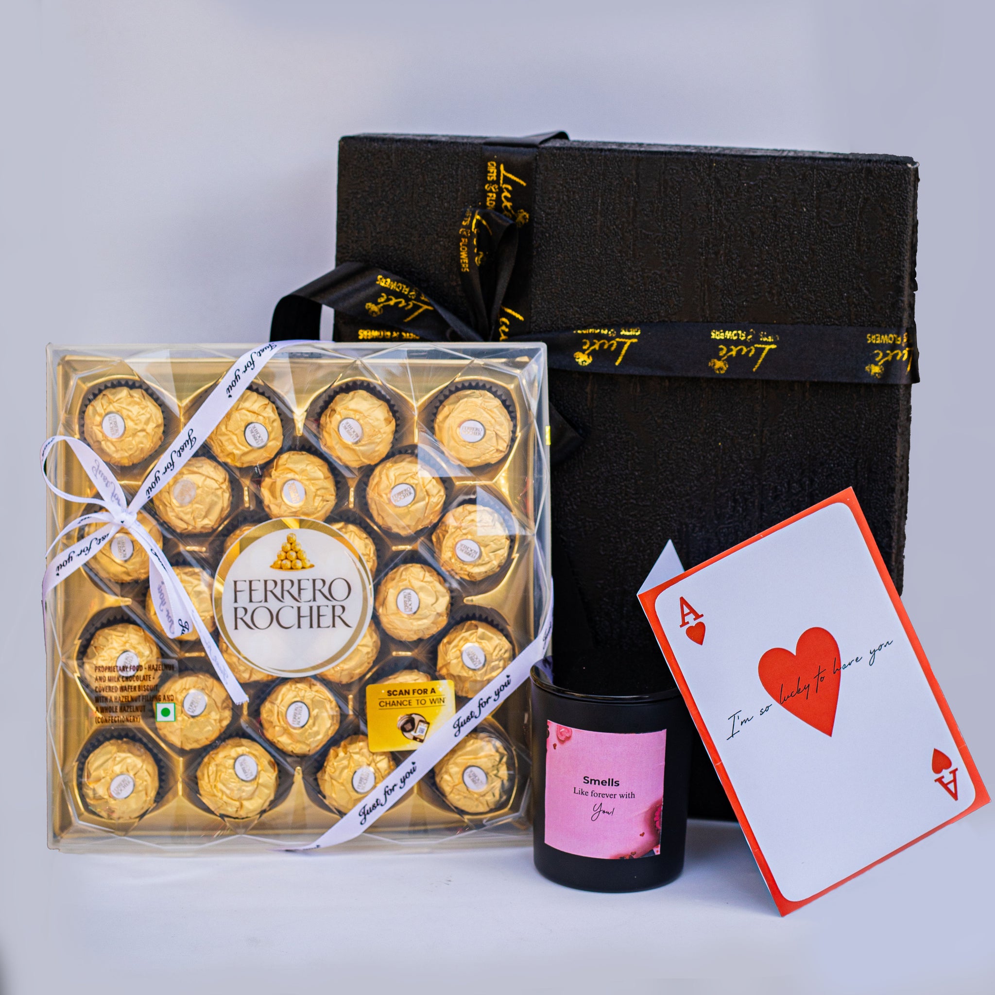 Sweet Relax combines indulgence with tranquility—a thoughtfully curated gift set featuring 24 Ferrero Rocher chocolates paired with a luxurious scented candle. Each piece is nestled in elegant packaging, complete with a heartfelt Valentine's card to express your affection. Perfect for someone special who deserves a moment of calm and sweetness, this collection invites them to unwind with premium chocolate while the gentle fragrance creates an atmosphere of warmth and intimacy. An ideal choice for Valentine's Day or any occasion calling for a touch of refined romance.